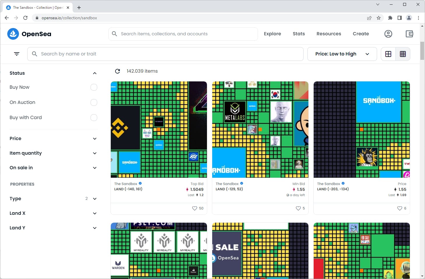 Land kan op de blockchain worden vastgelegd als eigendom van één persoon, wat ook geldt voor bijvoorbeeld kunstwerken, gebouwen en voertuigen. Gebruikers kopen virtueel land om hun stek in te richten of in de hoop hier later meer geld voor te kunnen vragen, via een geïntegreerde NFT-marktplaats of een openbare marktplaats als OpenSea.