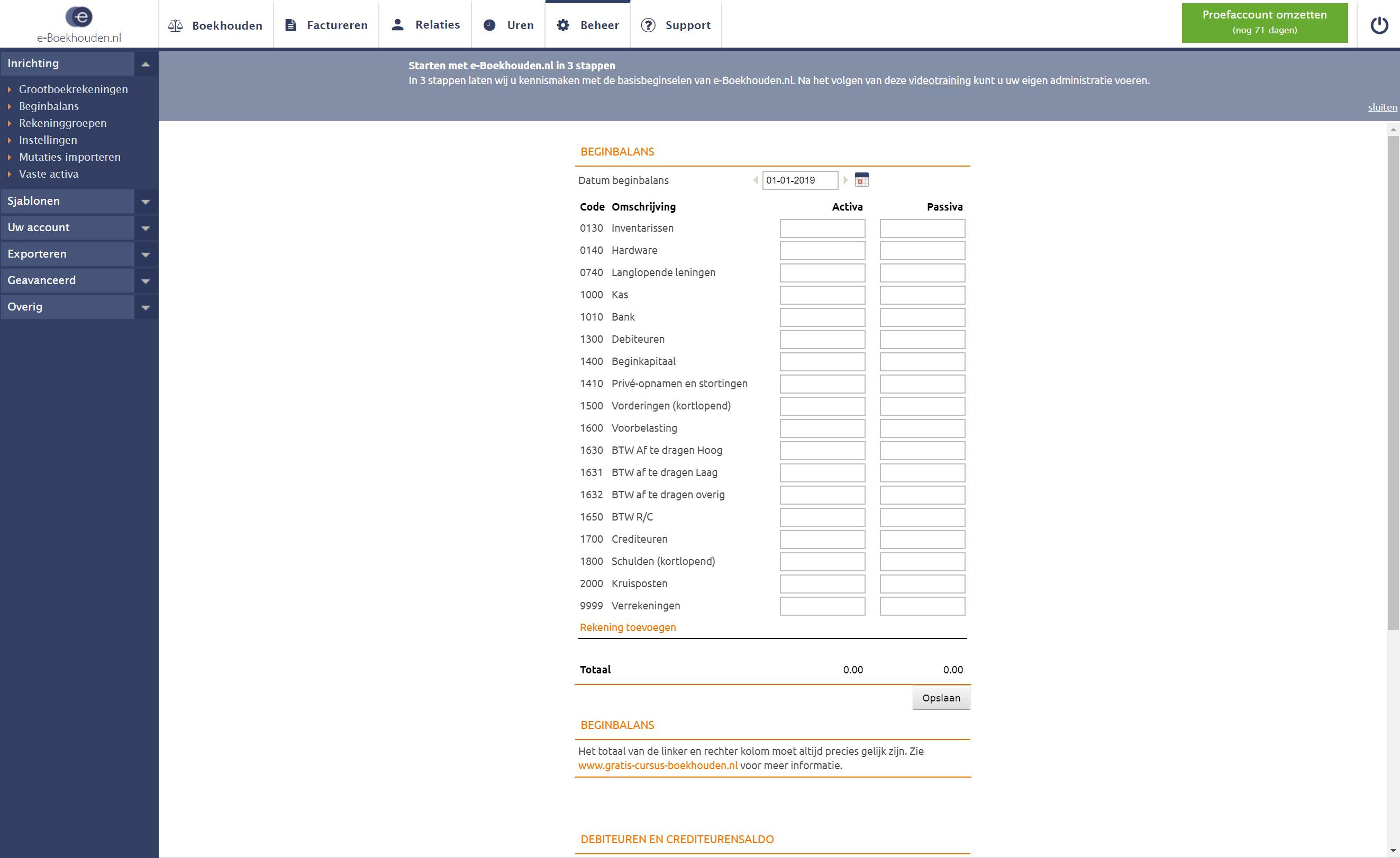 We beginnen direct met het lastigste: de beginbalans, te vinden via Beheer / Beginbalans. Dit is in principe de samenvatting van alle financiële aspecten waaruit je bedrijf bestaat: inkomsten, uitgaven, vorderingen, … Heb je geen idee waar we het over hebben, dan maak je waarschijnlijk al gebruik van een boekhouder (want dit maakt ook onderdeel uit van je analoge administratie) en kun je deze informatie bij hem/haar opvragen. Essentieel is in ieder geval dat het totaal van de linker- en rechterkolom (oftewel de activa en passiva), gelijk zijn. Maar voor je dit in kunt vullen, moet je eerst je grootboekrekeningen instellen.