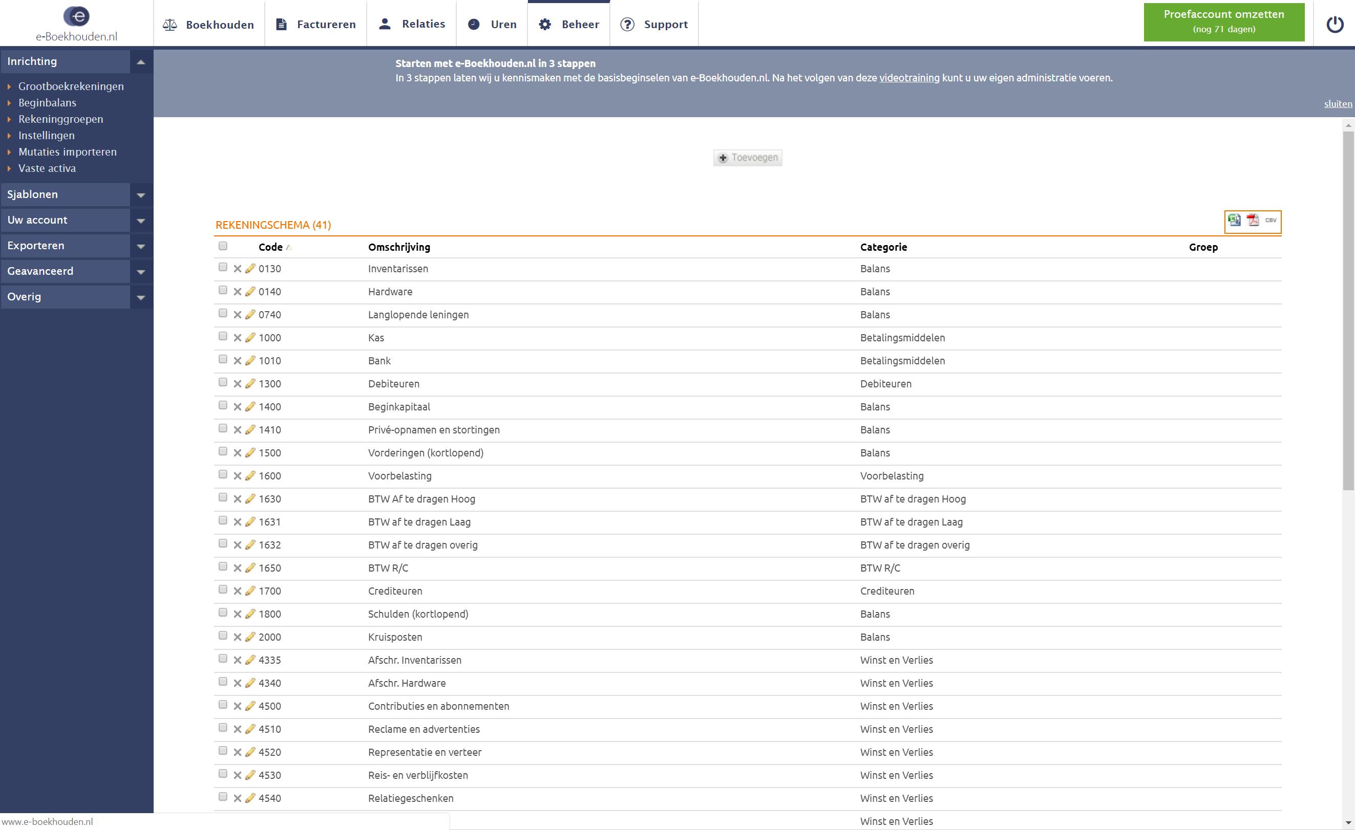 Laat je niet intimideren door een woord als grootboekrekening. Je kunt je administratie het beste zien als een grote kast met lades. Elke lade vertegenwoordigt een onderdeel van je bedrijf, zoals je bankrekening (betalingsmiddel), een abonnement ergens op (Winst en Verlies), je inventaris (Balans) enzovoort. Van het woord lade raak je hoogstwaarschijnlijk niet in de stress, en een grootboekrekening is precies hetzelfde. Voor je online administratie is het daarom belangrijk dat je alle elementen van je bedrijf in kaart brengt. Klik op Beheer en vervolgens op Grootboekrekeningen. Je ziet hier heel veel ‘lades’ staan, waarvan je het merendeel nooit zult gebruiken. Kijk of je alle kosten en baten van je bedrijf kwijt kunt in één van deze lades. Is dat niet zo, maak dan zelf een nieuwe lade, oftewel grootboekrekening, aan.