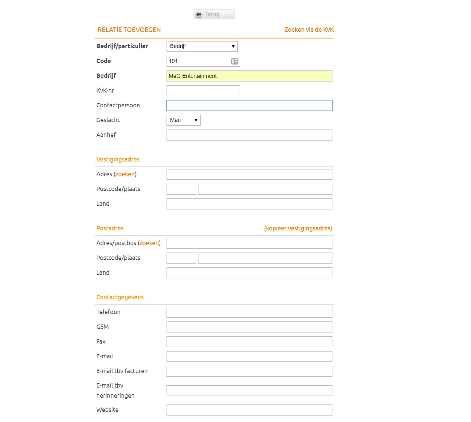 Voor je administratie is het uiteraard belangrijk om te weten van wie je geld hebt ontvangen en aan wie je geld hebt betaald. Om die reden is het noodzakelijk om relaties aan te maken. Je doet dat door bovenin te klikken op Relaties en vervolgens op Toevoegen in het linkerdeelvenster. Dit is vrij eenvoudig, het gaat simpelweg om alle contactgegevens van de betreffende klant of opdrachtgever.