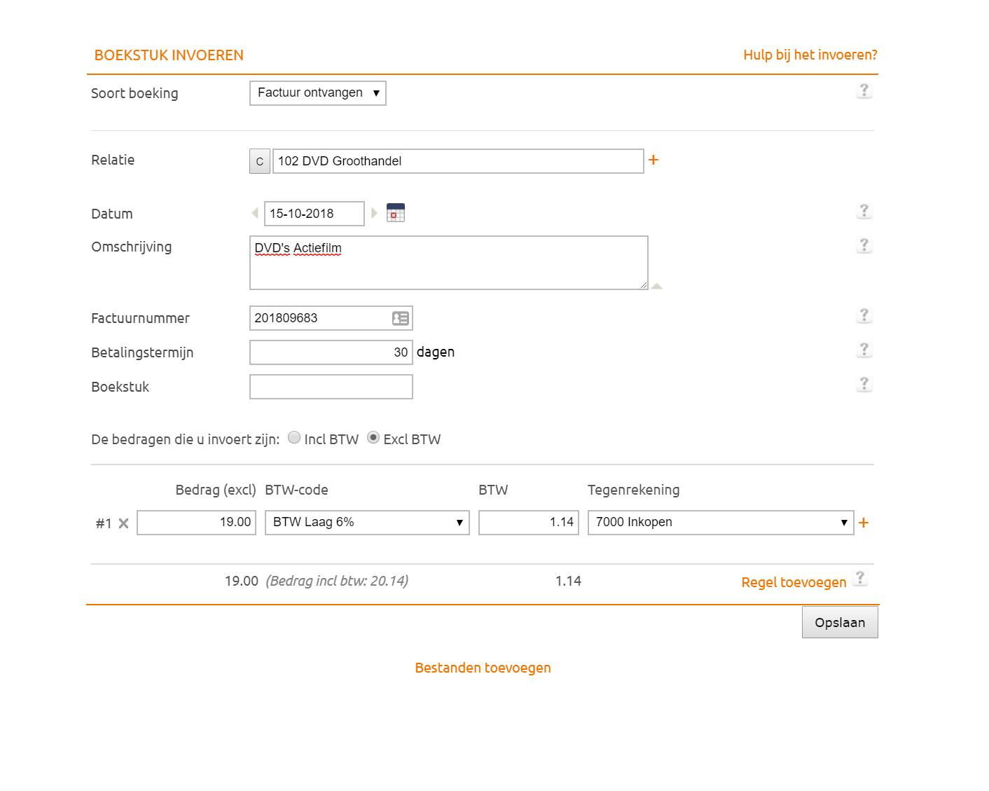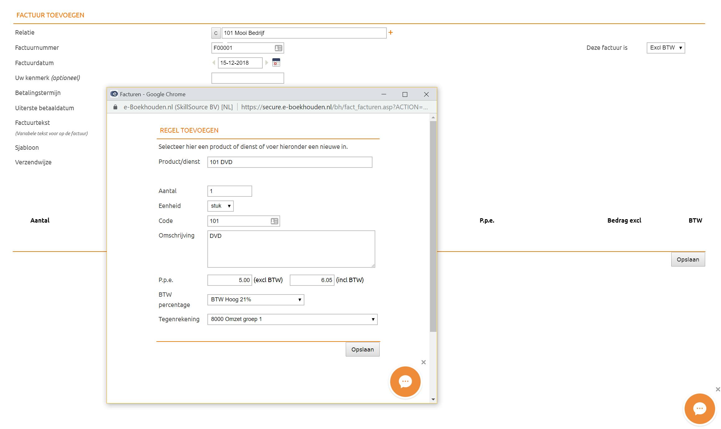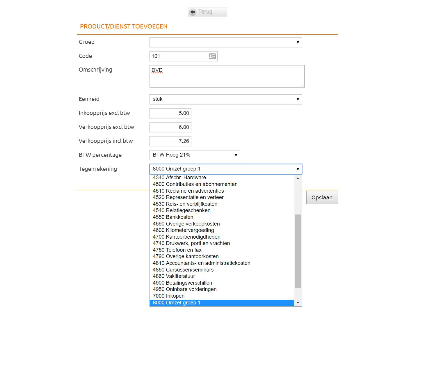 Stel dat we je nu vragen een factuur te maken, dan vul je waarschijnlijk simpelweg in wat je gedaan hebt en hoeveel dat kost. In een digitale boekhouding gaat dat net zo, alleen wil het boekhoudpakket weten waarop een bepaald product of een bepaalde dienst moet worden afgeboekt. Daarvoor maak je producten aan. Klik op Factureren en vervolgens onder Producten en Diensten op Toevoegen. Je dient nu een code in te vullen voor de dienst of het product (dit mag je zelf bedenken) en een beschrijving (bijvoorbeeld: DVD). Vervolgens kies je een Eenheid, in ons geval Stuk. Als de eenheid die je nodig hebt (bijvoorbeeld Woord als je artikelen schrijft en per woord betaald krijgt) nog niet bestaat, kun je deze aanmaken onder het kopje Eenheden aan de linkerkant. Vul de inkoopprijs in als deze van toepassing is, en de verkoopprijs exclusief btw. Selecteer het btw-tarief en de verkoopprijs inclusief btw wordt direct getoond. Bij Tegenrekening selecteer je in welke ‘lade’ dit product thuishoort. Dat kan dus heel algemeen zijn (Omzet groep 1), of heel specifiek (DVD). Al moet je daarvoor dus wel eerst een grootboekrekening voor DVD hebben aangemaakt. Het handige is nu: de btw wordt automatisch in de ‘lade’ BTW Af te dragen geplaatst.