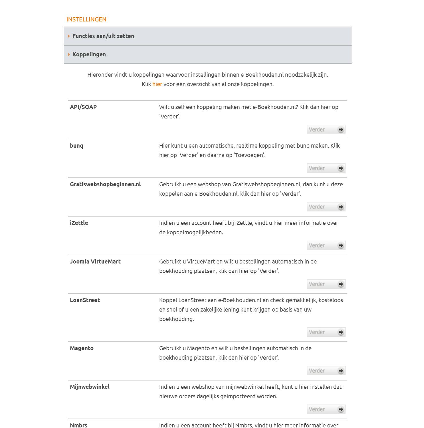 In principe kun je alles in je boekhoudpakket handmatig doen, maar onder het kopje Beheer heb je ook de mogelijkheid om allerlei koppelingen te maken. Zo kun je ten eerste een koppeling maken met je boekhouder, zodat deze bij je administratie kan en daarmee je aangifte kan doen, maar je kunt ook een koppeling maken met je bank, zodat je niet telkens handmatig je mutaties hoeft te importeren en exporteren. Ook vind je hier de koppeling met je webwinkel, zodat je de facturen van bestellingen automatisch in je digitale boekhouding kunt laten inlopen. Het is allemaal niet heel erg moeilijk, en op de supportpagina vind je een uitgebreide uitleg van hoe het allemaal werkt. We raden je dan ook aan om dat absoluut te gaan verkennen.