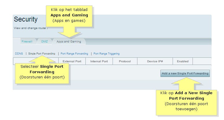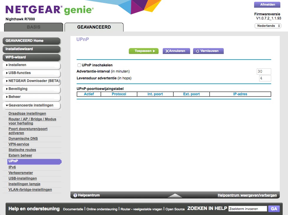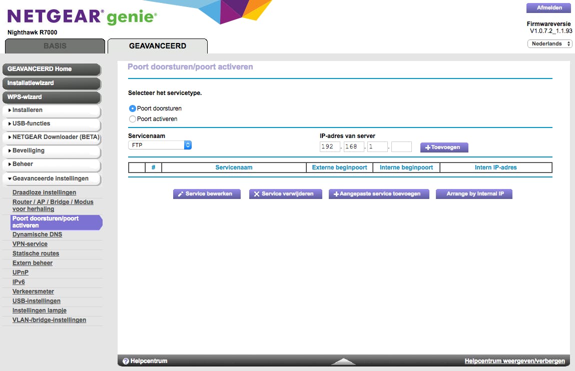 Om op een NETGEAR-router een poort door te sturen, ga je naar http://routerlogin.net of het IP-adres van je router. Vervolgens ga je naar het tabblad Geavanceerd en dan links naar Geavanceerde instellingen. Klik nu op Poort doorsturen/poort activeren alwaar je regels in kunt stellen voor poorten. Het is vervolgens mogelijk om een service te kiezen, bijvoorbeeld FTP, en daarna het IP-adres waarnaar deze poort doorgestuurd moet worden. In dit geval probeert NETGEAR het gebruiksvriendelijk te maken door services te forwarden in plaats van poorten. Elke service bestaat uit een naam, de betreffende poort(en) en het TCP- of UDP-protocol. Wil je zelf een service aanmaken, dan klik je op de knop Aangepaste service toevoegen en voer je de gevraagde informatie in, waaronder een naam, het protocol en de start- en eindpoort. Wil je maar één poort doorsturen, dan vul je daar twee keer hetzelfde in. Om UPnP uit te zetten, ga je in hetzelfde menu als voor poort doorsturen naar UPnP en vink je UPnP inschakelen uit.