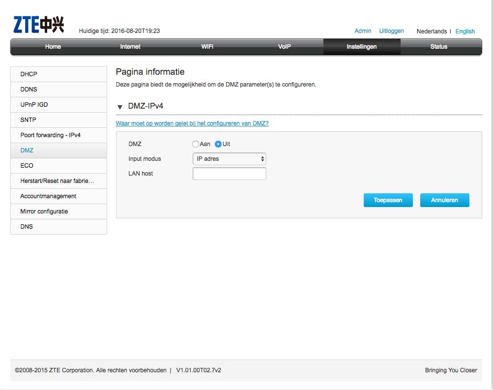 Indien je modem/router geen bridgemodus heeft, dan kun je de DMZ-modus gebruiken. Een DMZ, voluit een demilitarized zone, is daar waar alles is toegelaten. In een bedrijf is dat een compleet apart netwerk. Bij een thuisnetwerk betekent een DMZ dat de router dan alle poorten voor een specifiek apparaat openzet. Door het IP-adres van jouw eigen (nieuwe) router in te vullen, zal de originele router van je internetprovider geen poorten meer blokkeren. Zorg voordat je het IP-adres van je tweede router invult, dat de router van je internetprovider een vast IP-adres toekent aan je eigen router. Daarvoor log je in op je eerste router met een pc, terwijl je tweede router met een kabel is verbonden met de eerste router. Vervolgens ga je naar iets genaamd als DHCP binding, statisch IP-adres of Adresreservering. Daar kun je vaak uit een van de aangesloten apparaten kiezen, waarna het MAC-adres automatisch wordt ingevuld.