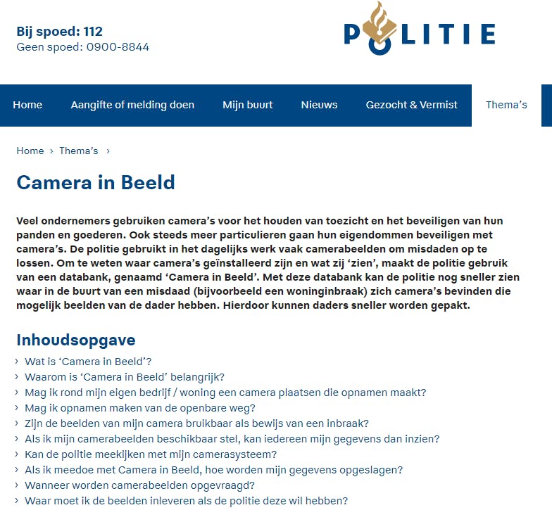 Soms is het onvermijdelijk om een klein stukje van de openbare weg te registreren. Dit mag zolang de camera maar één aantoonbaar doel dient: de beveiliging van het persoonlijk bezit. Je mag beelden niet openbaar maken en ook niet langer dan nodig bewaren (veelal tot 28 dagen). Ook moet je duidelijk zichtbaar vermelden dat er camerabeveiliging aanwezig is, bijvoorbeeld met sticker of bordje bij de toegangsdeur. Het kan ook handig zijn om voordat je een camera ophangt er met buren en buurtgenoten over te spreken. Camerabeelden mogen als bewijs worden ingebracht bij bijvoorbeeld een inbraak. De Politie houdt met het project ‘Camera in Beeld’ zelfs een databank van bewakingscamera’s bij, ook van particulieren, zodat ze weten waar extra bewijs kan worden vergaard.