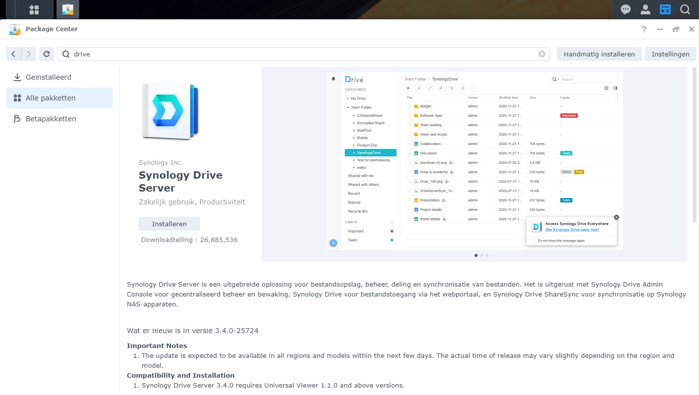 Functionaliteit toevoegen aan een NAS gaat bijna altijd door een software-uitbreiding te installeren. Hiervoor is er op de NAS een appstore aanwezig waar je deze software selecteert, installeert en daarna configureert. Als voorbeeld nemen we Synology Drive, hét antwoord van Synology op cloudopslag als Google Drive en Microsoft OneDrive. Met Synology Drive kun je bestanden opslaan, delen en zelfs bewerken, vanaf elk apparaat en als je wilt ook van elke plek op aarde. Om deze (of andere) functionaliteit aan de NAS toe te voegen, open je Package Center. Blader naar Synology Drive Server of gebruik de zoekfunctie bovenin het scherm. Druk op de knop Installeren om de functionaliteit toe te voegen.