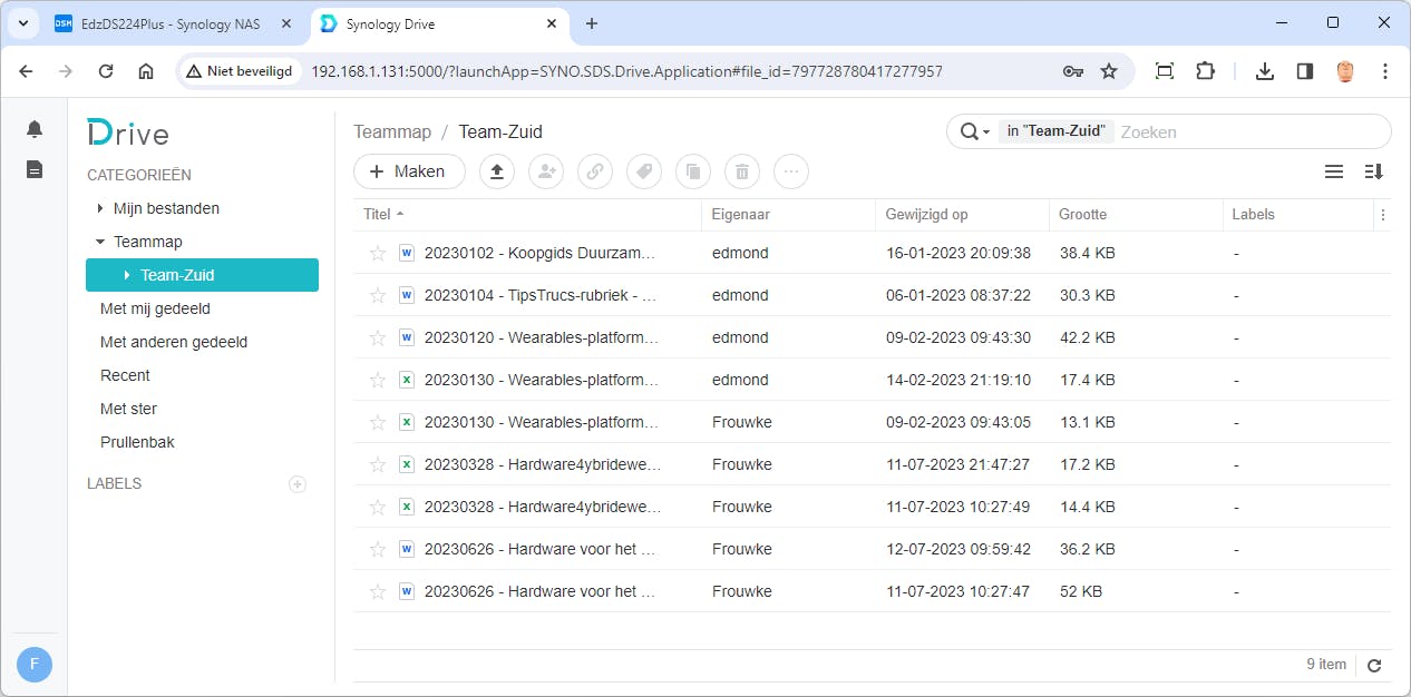 Na de installatie lijkt er weinig veranderd, maar ga je nu naar jouw persoonlijke Synology Drive, dan zijn er bij Maken ineens de documenttypen Document, Spreadsheet en Dia’s bijgekomen. Maak je zo’n document, dan opent de Synology-versie van Word, Excel of PowerPoint zich in de browser. Maak je het document in een teammap, dan kunnen ook anderen het bestand openen en bewerken. De wijzigingen zijn voor iedereen zichtbaar en via de knop Geschiedenis tonen kun je eerdere versies zien en ook wijzigingen ongedaan maken. En dat werkt zowel in de browser als via een van de client-apps op iOS, Android, Windows, Linux of Mac.