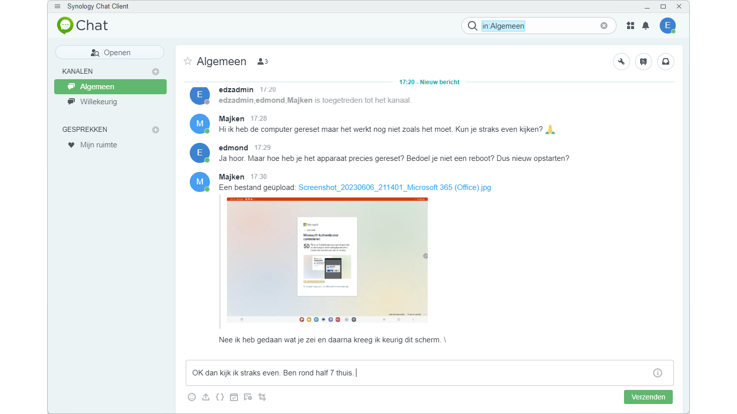 Een andere uitbreiding is Synology Chat. Hiermee kun je behalve samenwerken aan een document ook nog met andere gebruikers chatten. Hiervoor installeer je de Synology Chat Server op de NAS en op alle apparaten de Synology Chat-clientsoftware. De werking is verder gelijk aan die van Drive en Office: je geeft het serveradres op, plus de inloggegevens en het werkt. Vergeet niet op de NAS de gebruikers rechten te geven op de map Chat én via Configuratiescherm / Toepassingsrechten op het gebruik van de Chat-service.