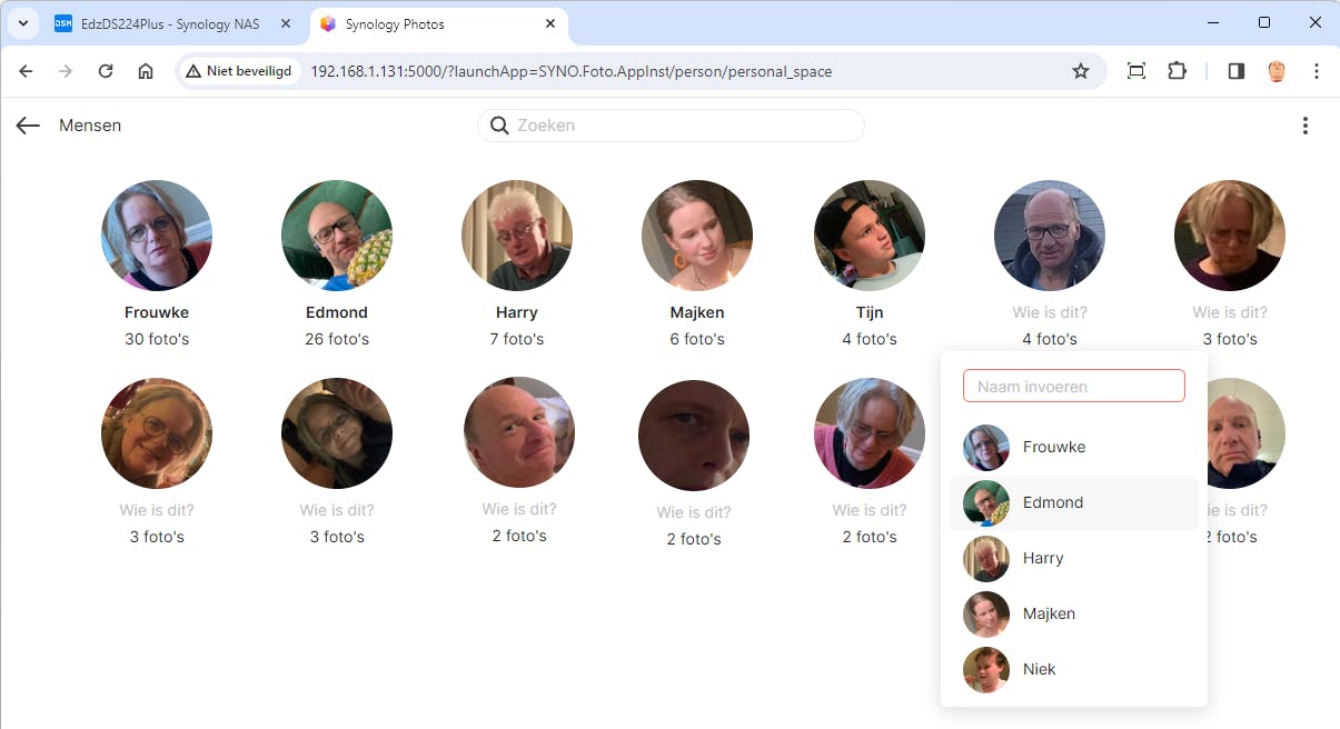 Voor de labels van personen klik je nadat je een reeks foto’s hebt geüpload op de knop Albums / Mensen. Hier zie je de gezichten die zijn herkend. Klik op Wie is dit? en typ de naam van die persoon. Doe dit voor alle stapels. Wordt dezelfde persoon meerdere keren herkend, selecteer dan die persoon uit de lijst met al eerder herkende personen. De foto’s met die persoon worden dan samengevoegd en de NAS leert diezelfde persoon volgende keren beter te herkennen.