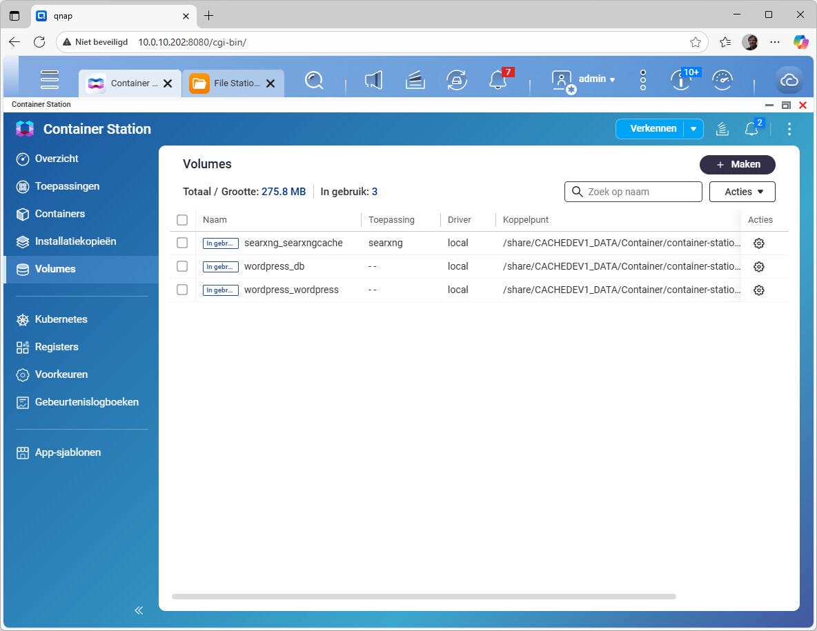 Voor het organiseren van je bestanden op een NAS gebruik je standaard al gedeelde mappen. Ga je met Docker werken, dan zul je óók zo'n map gebruiken voor de opslag voor je containers. Synology maakt die map standaard onder /docker. Bij QNAP is dat (meestal) /Container. Stel dat je WordPress wilt installeren. Het persistente pad in de container is in dit geval /var/www/html. Daar worden alle websitebestanden opgeslagen. Bij Synology zul je dan een map zoals /docker/wordpress maken die je bij de configuratie koppelt aan het container-pad /var/www/html. Er kunnen ook meerdere paden zijn. SearXNG gebruikt in de container bijvoorbeeld /etc/searxng voor de configuratie (zoals settings.yml) en /var/cache/searxng voor data en cachebestanden. Beide kun je dan koppelen met de NAS, bijvoorbeeld onder /docker/searxng/config en /docker/searxng/cache. Gebruik eventueel de bestandsbeheerder (zoals File Station) om de mappen vooraf aan te maken of aangemaakte bestanden te bekijken!