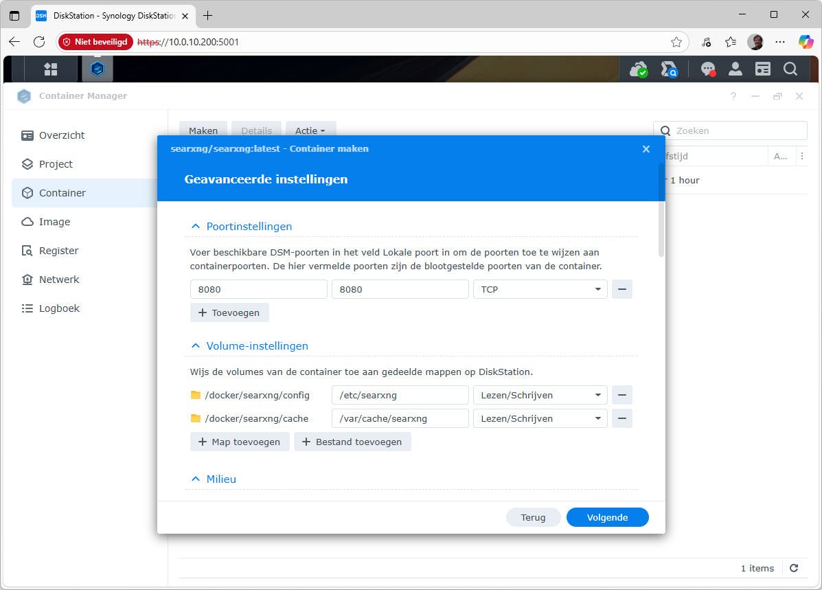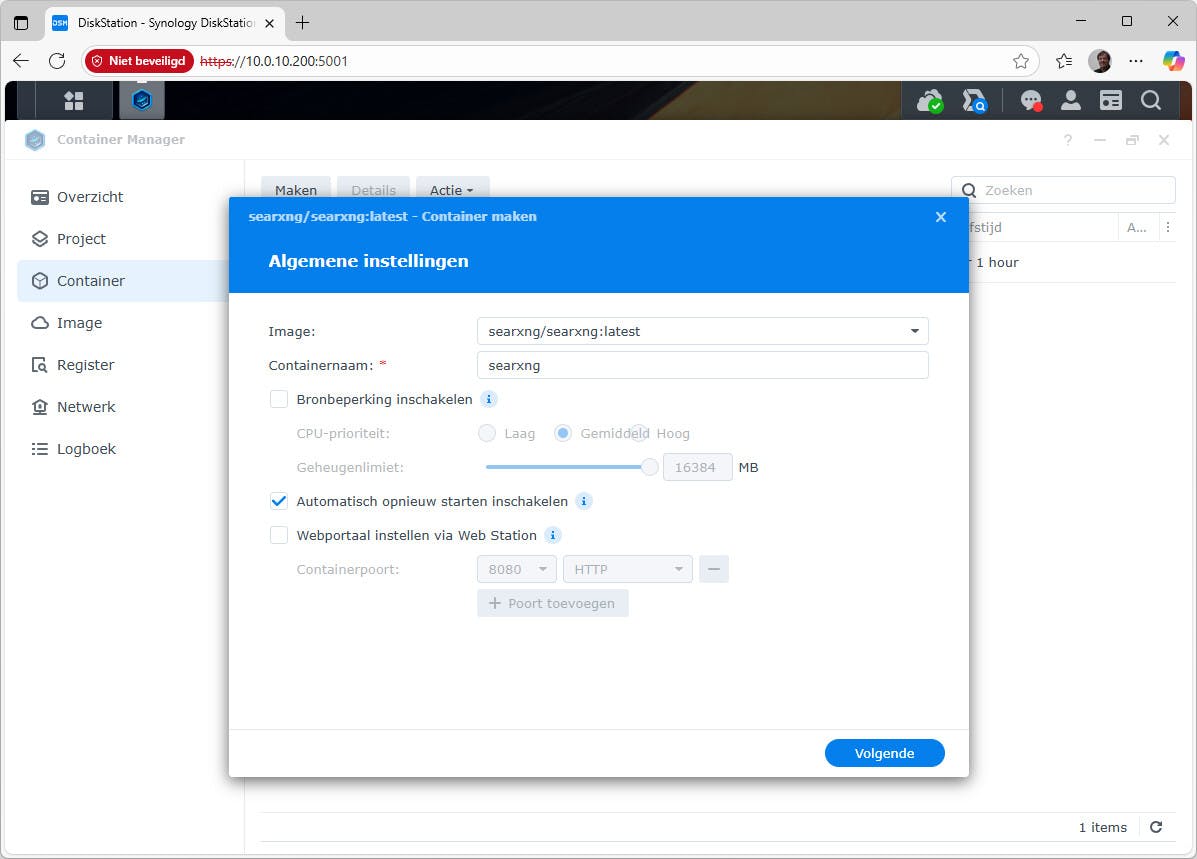 We gaan als voorbeeld een container voor SearXNG maken, een privacyvriendelijke zoekmachine die live resultaten bij andere zoekmachines ophaalt. Ga hiervoor naar Container en kies Maken. We gebruiken de image searxng/searxng. Bij het maken van de container hoef je bij Algemene instellingen niet veel te veranderen. Wel handig is de optie Automatisch opnieuw starten inschakelen, voor hogere beschikbaarheid. Op het tweede scherm, bij Geavanceerde instellingen, zie je onder het kopje Poortinstellingen dat deze toepassing in de container poort 8080 gebruikt. Bij Lokale poort kies je de lokale poort (op de host), zoals 8080 (of iets anders, als deze al in gebruik is). Na het maken van de container kun je de zoekmachine bereiken via de gekozen lokale poort, zoals http://ip-NAS:8080. Onder het kopje Volume-instellingen maak je zoals eerder toegelicht een bind mount. Koppel /docker/searxng/config met /etc/searxng en koppel /docker/searxng/cache met /var/cache/searxng. Via het venster kun je naar de map op de NAS bladeren om deze aan te wijzen (en eventueel ook aan te maken).