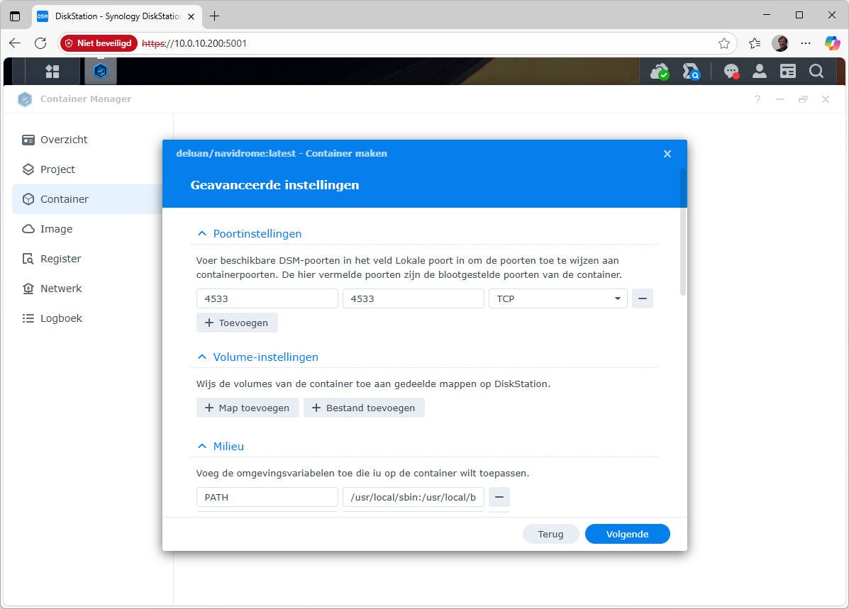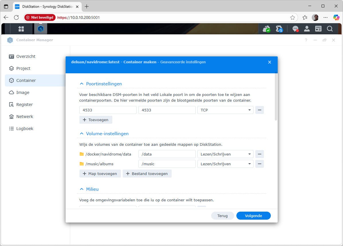 Een van de voordelen is dat toepassingen bestanden op de NAS kunnen gebruiken. We noemden NaviDrome al, een populaire muziekspeler. Bij het maken van deze container koppel je poort 4533 aan de lokale poort, zoals 4533. Bij de volumes moet je opletten. NaviDrome gebruikt /data voor gegevensopslag en /music voor muziek. Koppel bij Volume-instellingen daarom bijvoorbeeld /docker/navidrome/data aan /data. Staat je muziek op de NAS onder /music/albums, dan koppel je precies die map aan /music in de container. Kies hier eventueel voor alleen leestoegang, omdat deze toepassing geen bestanden hoeft te wijzigen. Na het starten van de container zul je het programma even de tijd moeten geven om alle muziek te indexeren.