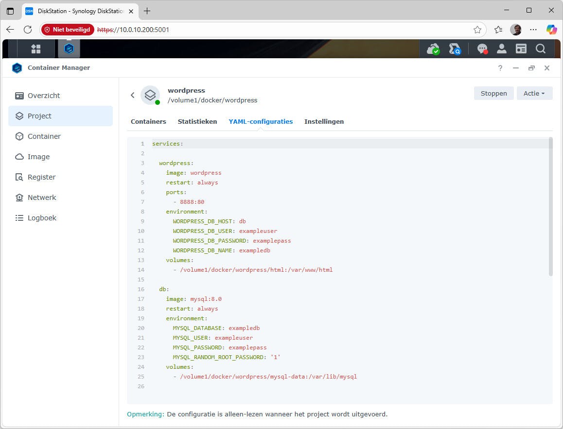 Wil je bij Synology met Docker Compose werken dan ga je naar Project en kies je Maken. Je kunt bij Bron kiezen om zelf een docker-compose.yml te uploaden, maar ook een nieuw bestand maken. Dat laatste heeft meestal de voorkeur. Je kunt de configuratie dan in het venster plakken en meteen nog wat persoonlijke aanpassingen maken. We nemen WordPress als voorbeeld dat twee containers heeft: één voor WordPress zelf en één voor een database (zoals MySQL of MariaDB). Je zet ze samen in één project en beheert ze daarna als geheel, in plaats van als twee losse containers. Bij Naam van project vullen we in wordpress (alleen kleine letters). Bij Pad kiezen we een gedeelde map op de NAS, zoals /docker/wordpress. Bij Bron kiezen we voor het maken van een docker-compose.yml. Hieronder zie je het voorbeeld voor de officiële image voor WordPress, waar we wat aanpassingen in gaan maken voor de NAS: