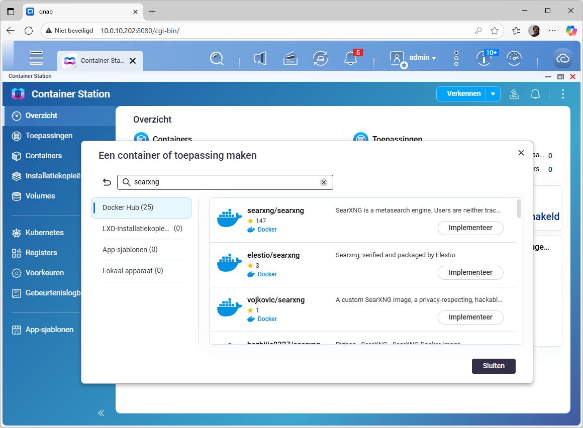 Voor het zoeken van een image open je Container Station en klik je op Verkennen. Hier kun je images op naam opzoeken. Voor Docker gebruik je de resultaten van Docker Hub, de centrale verzamelplek voor Docker-images. Kies bij de gewenste image de optie Implementeer. Je kunt dan een tag kiezen (zoals latest). Vervolgens kun je direct de container configureren. Dit behandelen we in de volgende stap. Voor een overzicht van alle gedownloade images kun je naar Installatiekopieën. Wij installeren ook in dit voorbeeld een container voor SearXNG.