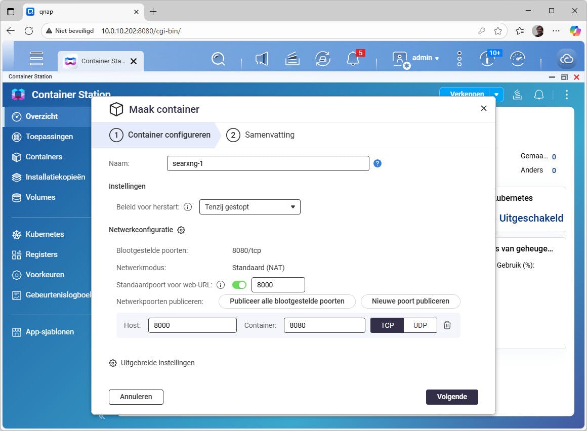 Bij de configuratie van de container kan de optie Standaardpoort voor web-URL wat verwarrend zijn. In feite maakt Container Station op basis van die poort een klikbare link die je in de webinterface ziet om de container te openen in je browser. Je kunt het dus zien als een soort shortcut. Je moet daaronder dus nog steeds de benodigde poorten openstellen. In dit voorbeeld vul je dus achter Host een poortnummer in, zoals 8000 (8080 is bij QNAP bezet!). Verander de poort bij Container (8080) niet. Vul bij Standaardpoort voor web-URL ook 8000 in, zodat de shortcut ook werkt.