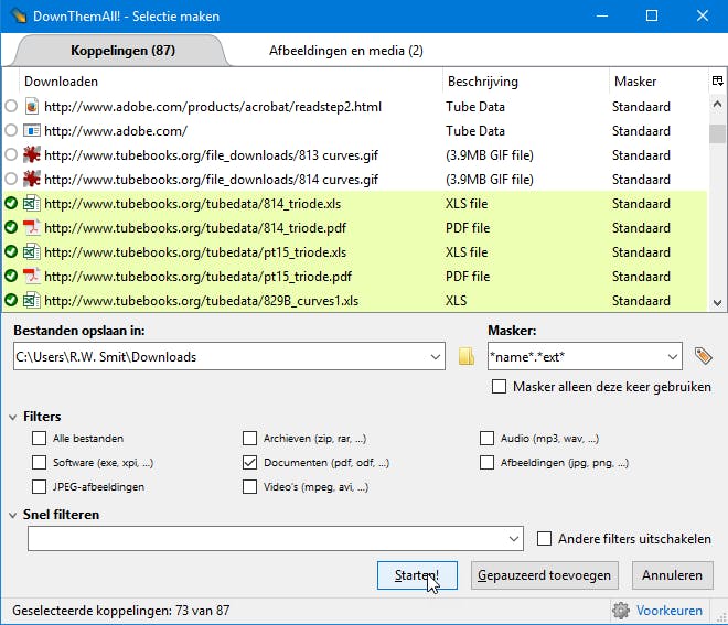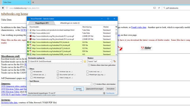 Vanaf nu werkt het allemaal heel simpel. Open een pagina met daarop een flinke verzameling links naar PDF-bestanden. Klik vervolgens op de net toegevoegde knop, waarna het hoofdvenster van DownThemAll opent. In principe detecteert de add-on álle beschikbare achter links verstopte content. Je kan in de lijst bovenaan de gewenste documenten en bestanden selecteren. Het kan ook sneller door onder Filter het gewenste bestandstype te selecteren. Kies eventueel een andere opslagmap dan het standaardexemplaar en klik op de knop Starten!. Daar komen je bestanden. De downloadsnelheid is overigens wel afhankelijk van wat de webserver te bieden heeft. Kleinere sites zijn vaak wat trager.