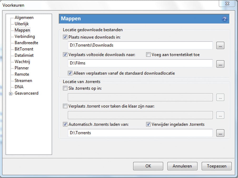 Omdat CouchPotato de gevonden torrentbestanden in een bepaalde map zet, moet u uw torrentclient die bestanden laten oppikken. In uTorrent doet u dat in het venster Voorkeuren op het tabblad Mappen. Selecteer de optie Automatisch .torrents laden en vul de map in die u in de vorige stap in CouchPotato gebruikte, in ons geval D:\Torrents. Vink de optie Verwijder ingeladen .torrents aan als u de map niet al te veel wilt vervuilen met reeds gedownloade torrents. uTorrent checkt periodiek die map en start automatisch de download. In hetzelfde mappenvenster kunt u ook de standaard downloadlocatie opgeven. Wij kiezen D:\Torrents\Downloads, maar zetten ook een vinkje bij Verplaats voltooide downloads. Dat voorkomt dat u in XBMC een film al ziet staan terwijl die nog gedownload wordt door uTorrent. We vullen dus D:\Films in als map waar de film naartoe wordt verplaatst zodra deze compleet is.