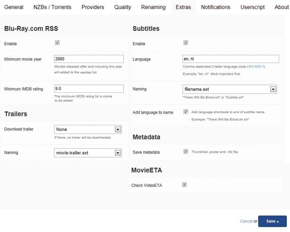 Nu u hebt gedefinieerd welke versies van films CouchPotato moet downloaden, kunt u op het tabblad Extra’s een aantal aanvullende instellingen invullen. Via de rss-feed van Blu-Ray.com kan CouchPotato zelf bijhouden welke bluray-films uitkomen en die meteen downloaden zonder tussenkomst: een optie voor de echte verzamelaar. Vink Enable aan en geef aan van welk jaar de film minimaal moet zijn (om oude films te vermijden) en welk cijfer het minimaal moet hebben op filmdatabase IMDB (om slechte films te vermijden). Verder kunt u hier instellen dat CouchPotato trailers moet downloaden voor elke gedownloade film, en eventueel ook ondertiteling. Voor die laatste kunt u de talen aangeven door in het veld Language de afkorting voor uw taal in te voeren, bijvoorbeeld nl. Ook metadata als een thumbnailafbeelding, poster en nfo-bestand kunnen meteen gedownload worden.