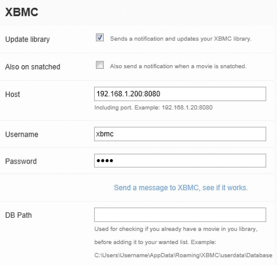 Op het tabblad Notifications kunt u CouchPotato laten samenwerken met diverse mediabibliotheken. Omdat wij op ons testnetwerk een htpc met XBMC hebben draaien, vullen we de gegevens van die server in: het ip-adres, de gebruikersnaam en het wachtwoord. Zorg wel dat de pc met XBMC inderdaad bereikbaar is met die gegevens en open de betreffende poorten op uw htpc. CouchPotato werkt daarna automatisch uw XBMC-bibliotheek bij als er een film is gedownload. CouchPotato ondersteunt ook Synology Media Server (als het op een Synology-nas draait), en een grote groep andere programma’s. Bekende XBMC-concurrent MediaPortal ontbreekt.