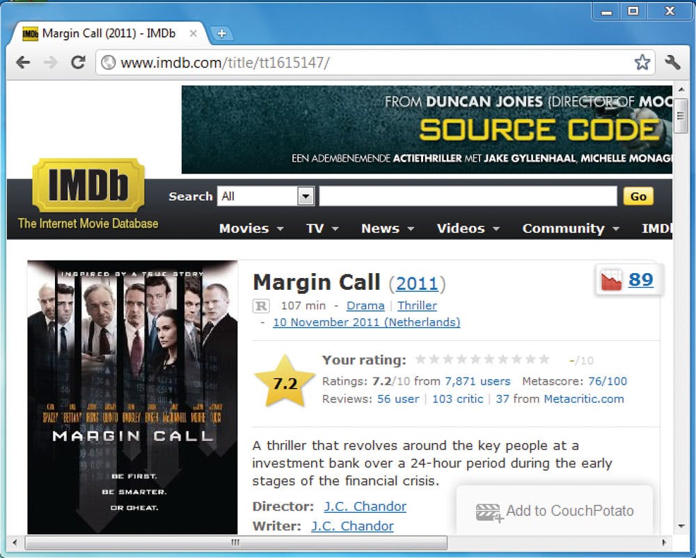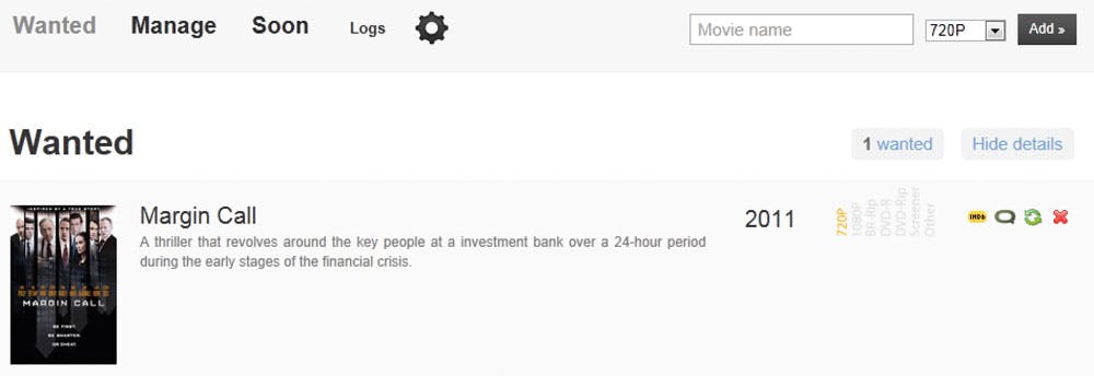 Nu u CouchPotato hebt verteld wat er moet gebeuren met uw downloadopdrachten, is het tijd om de eerste film toe te voegen. Na het lezen van een recensie over de film Margin Call besluiten wij dat we deze graag willen zien. Hebt u net als wij thuis een hd-tv staan, dan moet dat minstens in 720p-kwaliteit gebeuren. Rechtsboven in het scherm van CouchPotato vult u in het zoekveld de titel van de film in, in ons geval Margin Call. In het uitrolmenu kiest u 720P. Na een klik op Add zoekt CouchPotato de filmdatabases door en verandert het zoekveld in een rolmenu met mogelijke titels. In dit geval is er maar één zoekresultaat, en klikt u dus nogmaals op Add om hem toe te voegen aan de Wanted-lijst. Als u bovenin het scherm op Wanted klikt, ziet u alle films die u nog wilt hebben. Eens per dag checkt CouchPotato automatisch op de achtergrond of de gekozen films al in de gewenste kwaliteit beschikbaar zijn.