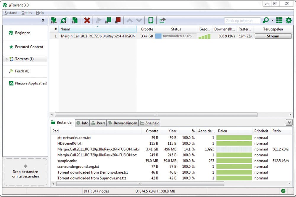 Margin Call is beschikbaar in 720p-formaat. CouchPotato heeft op de achtergrond een torrent gevonden via The Pirate Bay en die gedownload naar D:\Torrents. Op de Wanted-lijst wordt de film verplaatst naar de categorie Snatched. Zodra u uTorrent controleert, ziet u dat de torrent inderdaad automatisch is toegevoegd. Verder hoeft u niets te doen: de film komt binnen in de door u geselecteerde map.