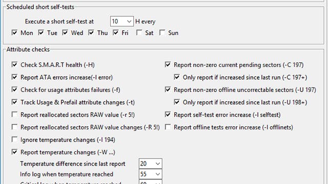 Het kan echter ook kleinschaliger, zoals met het gratis Smartmontools, dat je dan op elke gewenste client installeert. Het is beschikbaar voor uiteenlopende platformen vanuit een complexe opdrachtregelsyntax. Met Smartmontools-Win is er voor Windows echter ook een gui beschikbaar. Tijdens de installatie krijg je al een configuratievenster te zien waar je per client nagaat of de voorgestelde timings zinvol zijn (lees vooral: of de pc’s op dat moment zijn ingeschakeld zodat de smart-service zijn werk kan doen). Vervolgens kun je via het mee geïnstalleerde Reconfigure Smart Alert Settings aangeven naar welk e-mailadres een rapport moet worden gestuurd, zodra de tool mogelijke problemen vaststelt.