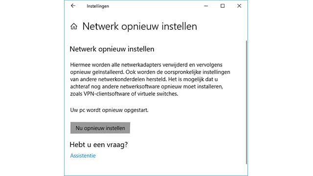 Ga hiervoor naar Windows Instellingen en kies Netwerk en internet, Status, Netwerk opnieuw instellen. Bevestig met Nu opnieuw instellen / Ja en herstart de pc na afloop. Je dient nu desgewenst wel bepaalde netwerksoftware, zoals vpn-clienttools of virtuele switches, opnieuw te installeren. Zorg er ook voor dat je pc van een privénetwerkprofiel gebruikmaakt als je bestanden of een printer wilt delen.