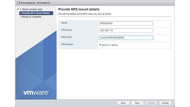 Kijk nu onderin het scherm, daar staat bij Pad koppelen de gegevens die nodig zijn om op de ESXi-server de map toe te voegen. Noteer het pad en log in op de ESXi-server. Ga naar Storage / New datastore / Mount NFS datastore / Next. Typ een naam, bij NFS-server zet je het ip-adres van de nas en bij NFS share het pad dat je hebt overgenomen. Klik daarna op Next / Finish. De opslagcapaciteit van de ESXi-server is uitgebreid met die van de nas. Je kunt deze net zo gebruiken als de opslag op de ESXi-server zelf, dus voor bestanden, maar ook om virtuele machines te maken. De snelheid van de nas en NFS is hoog genoeg om deze vm’s ook gewoon te gebruiken.