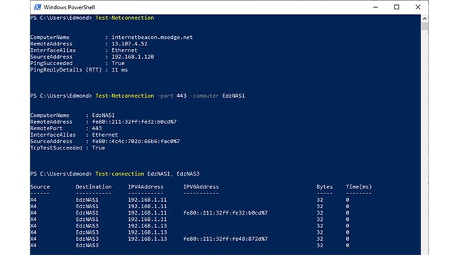Een cmdlet dat er sterk op lijkt, is Test-Connection. Dit is een soort eigentijdse ping, maar met handige extra opties. Je kunt bijvoorbeeld meerdere servers pingen via: