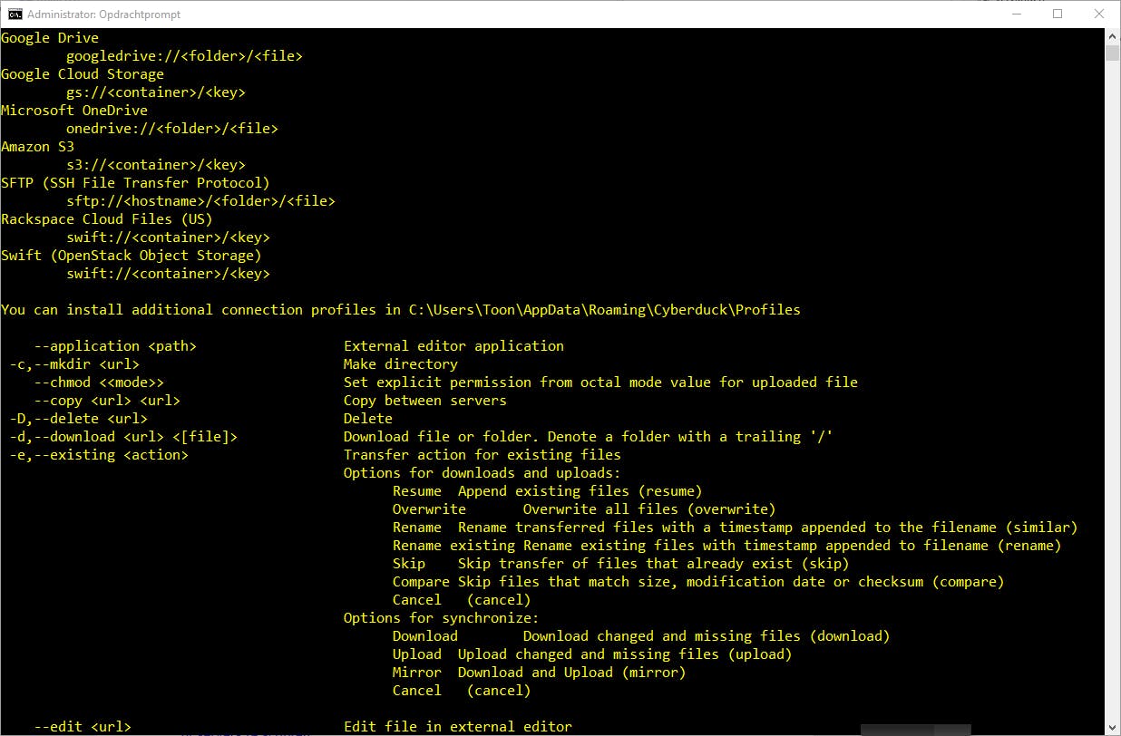 Er is ook een commandline-interface beschikbaar, met de naam Duck. Die biedt ongeveer dezelfde mogelijkheden en laat zich bedienen zowel vanuit de Windows Opdrachtprompt als een shell in Linux of MacOS. Eén voorbeeld: met onderstaand commando kopieer je een bestand van Dropbox naar een ftp-server, weliswaar na het invoeren van een autorisatiecode: