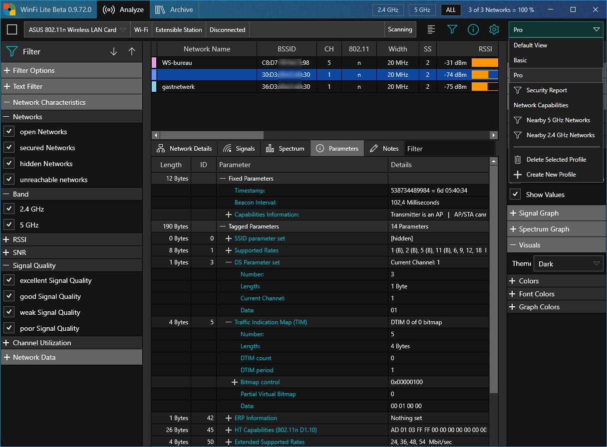 Voor uitgebreide details klik je gewoon op een netwerknaam. Klassieke ingrediënten zijn onder meer het (b)ssid, kanaalnummer en -breedte, netwerkprotocol, rssi en de producent. Maar WinFi Lite geeft nog meer technische details prijs, waaronder mcs rates, beacon-interval, qbss load element, traffic indication map enzovoort. Het is tevens mogelijk eigen notities aan toe te voegen. Er zijn ook heel wat filtermogelijkheden waarmee je snel focust op relevante informatie.