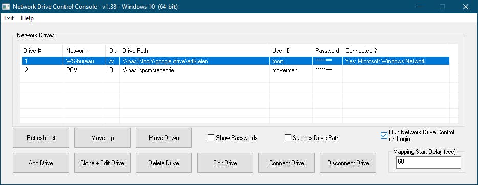 Het programma kan overweg met schijfkoppelingen via smb, cifs, netbios en webdav, maar niet via ftp. Na de installatie en een herstart van je pc start je Network Drive Control Console op en voeg je via Add Drive de netwerkverbindingen toe. Let er wel op bij elke verbinding het juiste netwerk te kiezen. Zorg dat er een vinkje staat bij Run Network Drive Control on Login, zodat de tool automatisch start bij het aanmelden op Windows.