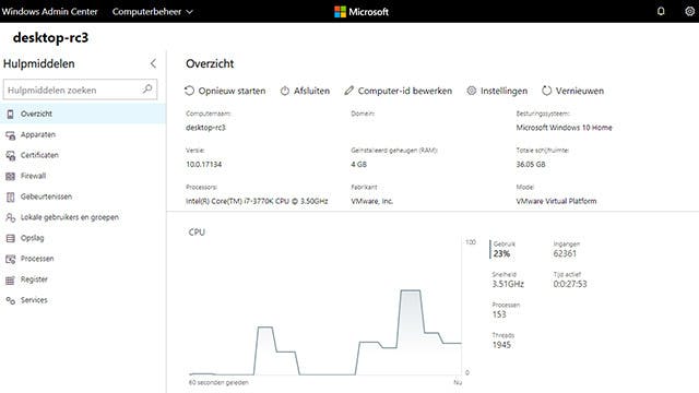 Het installatiebestand en uitgebreide documentatie vind je hier. Bij installatie op Windows 10 is het nodig bij de eerste keer opstarten het Windows Admin Center Client-certificaat te selecteren.