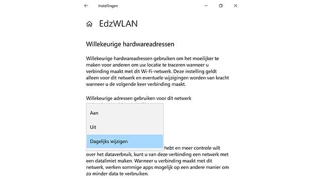Wil je het alleen op een bepaald netwerk inschakelen, maak dan eerst verbinding met dat netwerk. Klik dan op het pictogram van het draadloos netwerk en kies Eigenschappen. Ga naar Willekeurige hardwareadressen en kijk of je de instelling daarvan kunt wijzigen. Zo ja, dan ondersteunt de hardware deze functie en kies je Aan om de functie te activeren. Anders dan wanneer je het altijd wilt gebruiken, heb je nu de keuze tussen het Aan of Uitschakelen van de functie en als extra optie het Dagelijks wijzigen van het mac-adres.