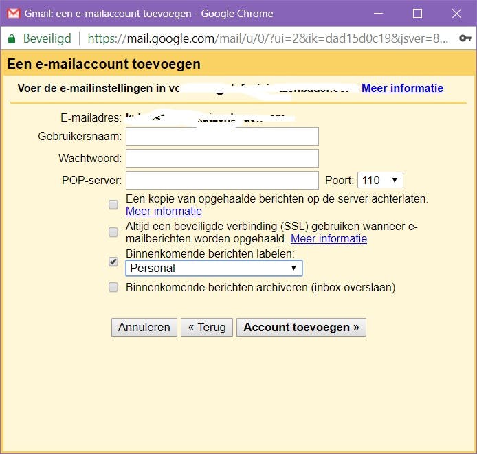 Daarnaast moet je ook weten welke serverpoort er wordt gebruikt bij je andere provider. Als je deze gegevens niet hebt, kun je deze opvragen bij de provider. Een veelgebruikte serverpoort voor niet-Gmailadressen is 995.