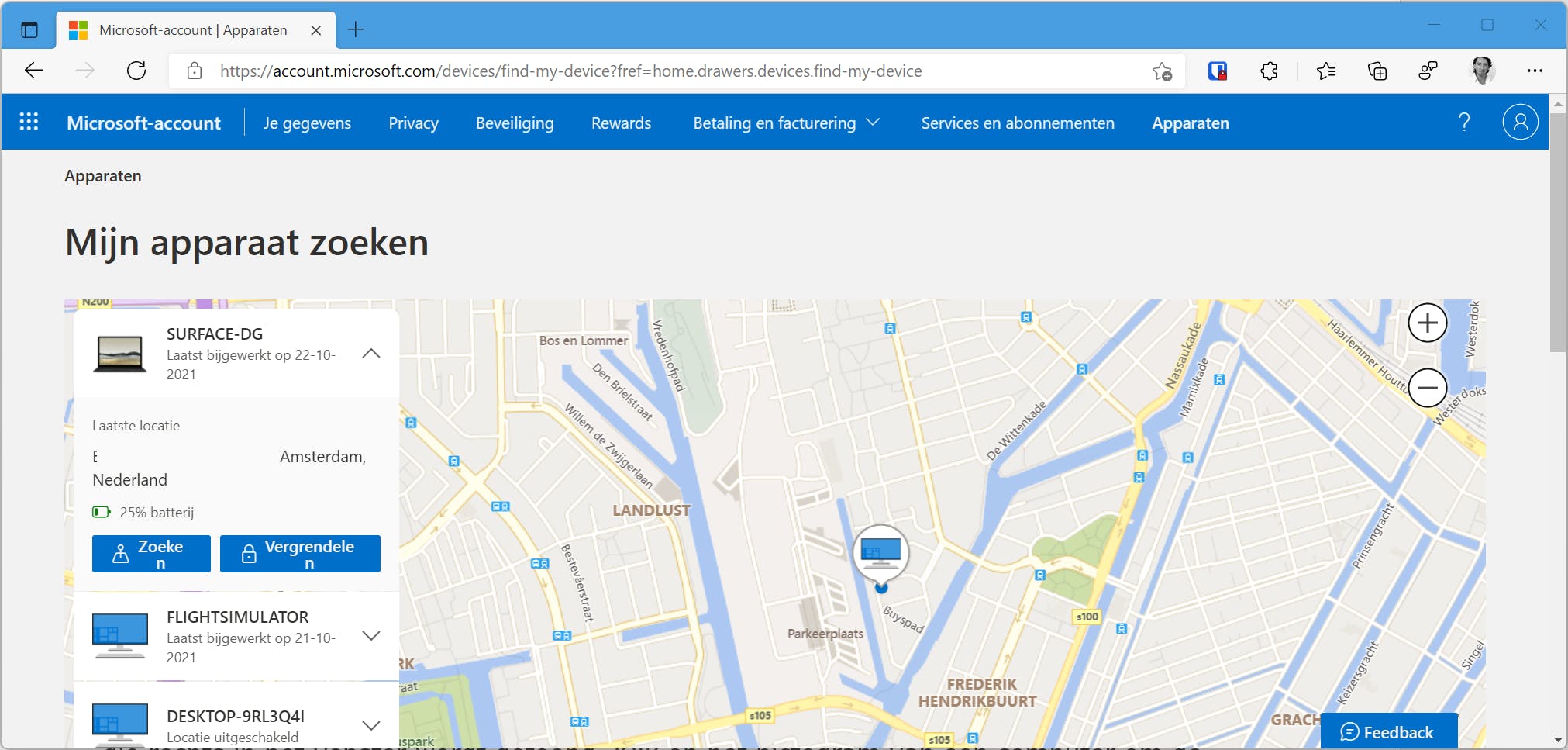 Zoek naar de sectie Apparaten. Klik op Mijn apparaat zoeken. Een kaart verschijnt, met aan de linkerzijde een overzicht van alle apparaten die aan het Microsoft-account zijn gekoppeld. Klik op het apparaat dat je zoek. Het deelvenster klapt uit en de laatst bekende locatie verschijnt.