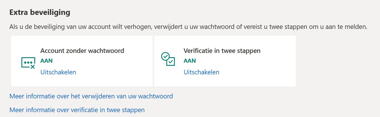 Installeer eerst de Microsoft Authenticator-app op de telefoon. Je vindt deze in de Apple Store en Google Play. Koppel de app aan de Microsoft-account. Open hierna https://account.microsoft.com via de browser en kies voor Geavanceerde beveiligingsopties. Kies Beveiliging (bovenin het venster) en klik op Aan de slag bij Geavanceerde beveiligingsopties. In de sectie Extra beveiliging klik je op Inschakelen bij Account zonder wachtwoord.