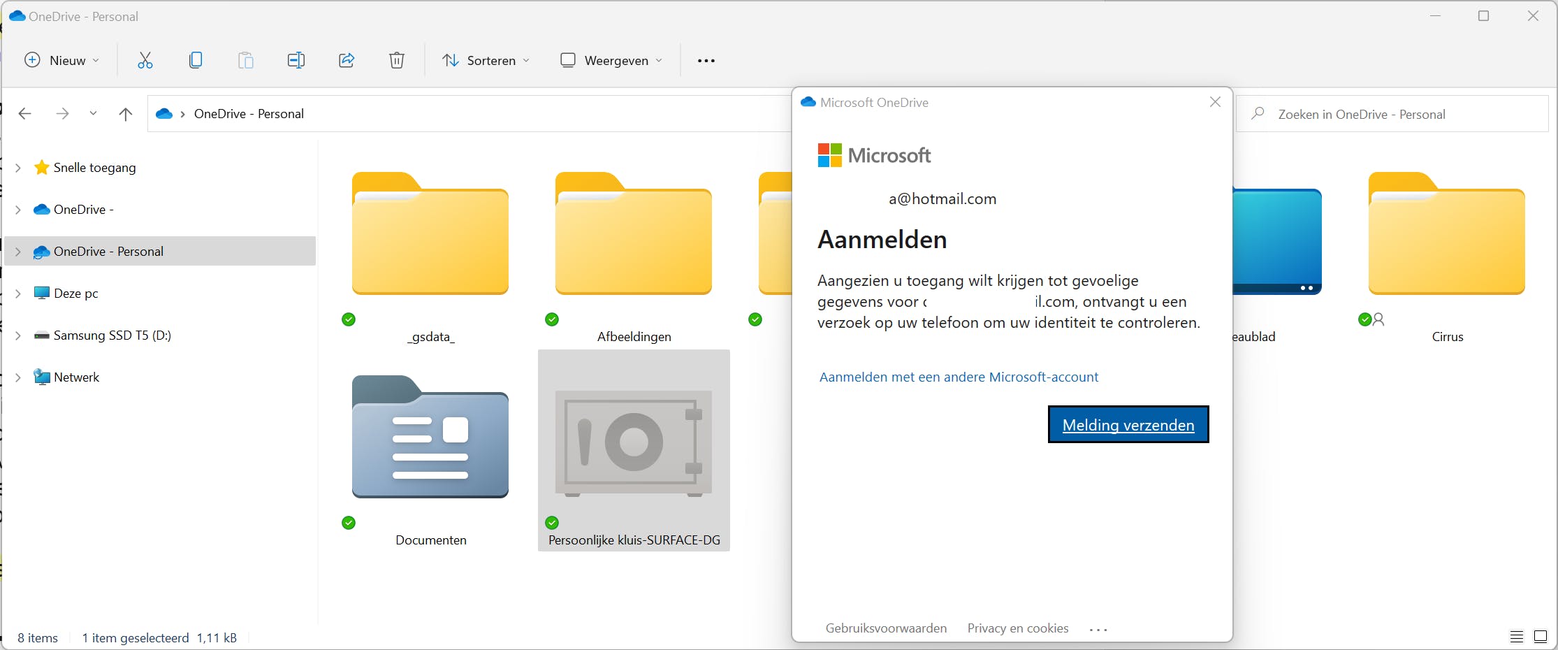 Open de verkenner met Windows-toets+E en klik op de map OneDrive. Dubbelklik vervolgens op Persoonlijke kluis. Volg nu de stappen van de wizard om de Persoonlijke kluis in te stellen. Hierbij wordt de identiteit gecontroleerd en kies je de verificatiemethode die moet worden gebruikt telkens als je de kluis opent.
