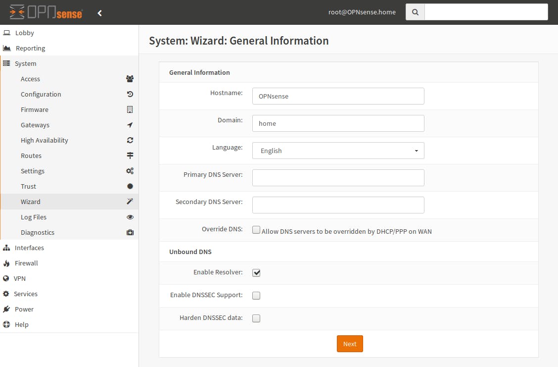 Als je in de webinterface aangemeld bent, wordt de eerste keer de wizard opgestart. Die leidt je door de initiële configuratie. Je hoeft deze overigens niet volledig te doorlopen: op elk moment kun je met een klik op het logo van OPNsense linksboven de wizard verlaten. Daarna kun je hem opnieuw opstarten in het menu System / Wizard.