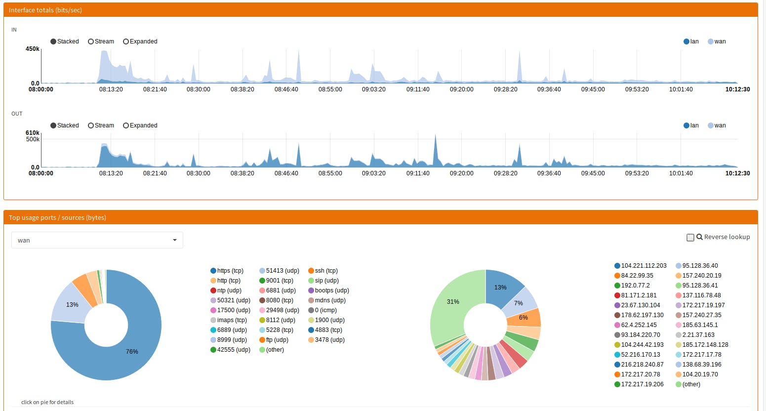 Deze ene pagina biedt ongelooflijk veel inzicht in je netwerk. Bovenaan rechts kies je de periode die je wilt bekijken. Je krijgt van je interfaces de in- en uitgaande bandbreedte over die periode te zien. Daaronder zie je taartdiagrammen met het percentage netwerkverkeer per poort en per bron.