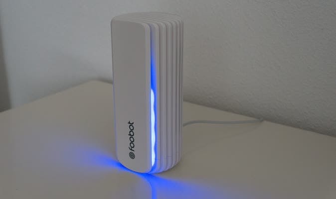 De Foobot is een luchtkwaliteitssensor met bijbehorende app en is een staande witte cilinder die 17 centimeter hoog is. De voorkant bevat een lichtstrip die afhankelijk van de luchtkwaliteit (gedeeltelijk) blauw of oranje kleurt. Hierdoor kun je ook zonder app de luchtkwaliteit aflezen. De installatie is niet heel moeilijk, maar wel enigszins apart. Je moet het apparaat op z'n kop zetten om hem te koppelen met je wifi-netwerk. Heb je de gegevens van je draadloze netwerk ingevoerd, dan kun je de Foobot weer normaal zetten en is het apparaat klaar voor gebruik. Lees ook: Domotica - Zo laat je al je apparaten samenwerken