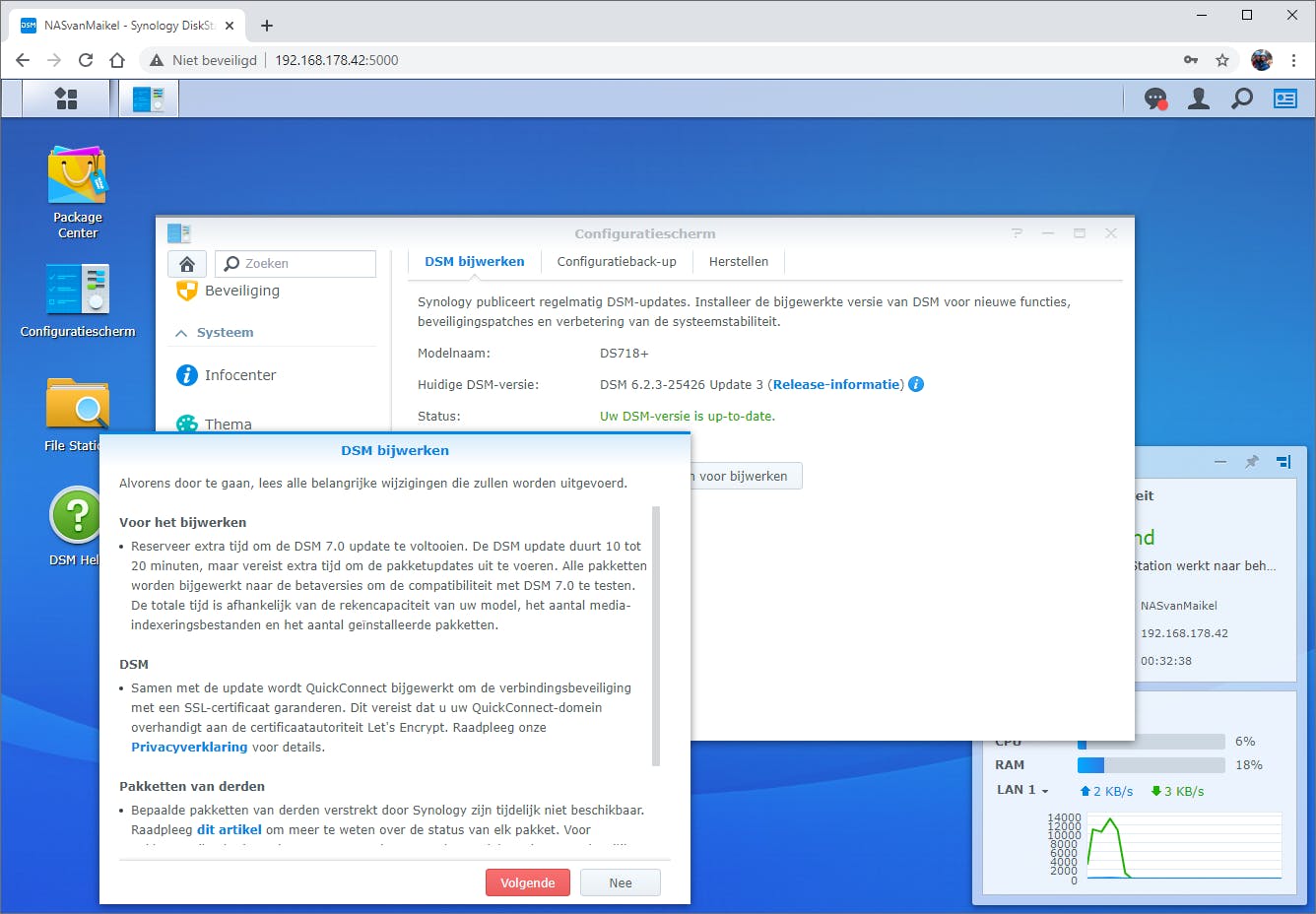 Neem de informatie eventueel even door en ga onderaan akkoord met de voorwaarden. Via Volgende / Ja start de installatie van DSM 7.0. Houd afhankelijk van de rekencapaciteiten van je NAS rekening met zo’n tien á twintig minuten wachttijd.
