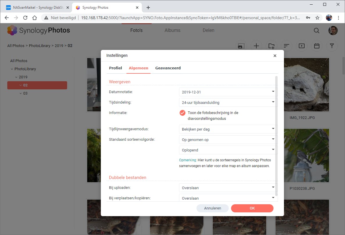 Er is een aantal instellingen die je in Synology Photos kunt wijzigen. We nemen ze even met je door. Klik rechtsboven op je accountnaam en kies Instellingen. Voeg vrijblijvend een profielfoto toe en ga naar Algemeen. Bepaal onder meer of je de tijdlijnweergave per dag of maand wilt weergeven en pas eventueel de datumnotatie aan. Verder wijzig je naar eigen inzicht de sorteervolgorde.