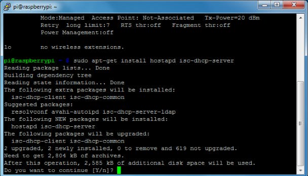 Om van de Pi nu een draadloos toegangspunt te maken, installeren we de software hostapd (host access point daemon), evenals een DHCP-server die IP-adressen uitdeelt aan de apparaten die met de Pi verbinden. Dat kan met de opdracht sudo apt-get install hostapd isc-dhcp-server. Als je een foutmelding krijgt omdat de repository te oud is, dan update je die eerst met sudo apt-get update. De bedoeling is dus dat de Pi via de ethernetkabel verbindt met internet, en iedereen die via wifi verbindt ook toegang tot internet geeft via de ethernetinterface.