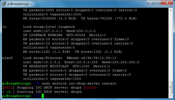 Nu moeten we configureren naar welke netwerkinterface de DHCP-server luistert. Dat kan met sudo nano /etc/default/isc-dhcp-server. Vul beneden bij de regel INTERFACES="" de naam van je draadloze netwerkinterface in die je in stap 2 gezien hebt, bijvoorbeeld INTERFACES="wlan0". Sla op en sluit af met Ctrl+O en Ctrl+X. Geef je wifi-interface nu een statisch IP-adres met sudo ifconfig wlan0 10.5.5.1 netmask 255.255.255.0. Herstart daarna de DHCP-server met sudo service isc-dhcp-server restart. Nu krijg je voor Starting ISC DHCP server: dhcpd in het groen ok te zien.