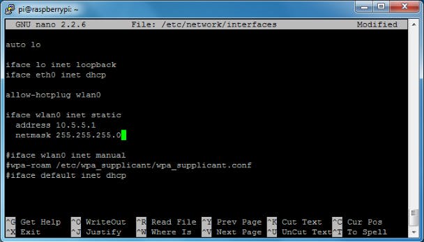 Nu moeten we nog instellen dat wlan0 elke keer bij het opstarten van de Raspberry Pi hetzelfde statische IP-adres krijgt. Dat kan met sudo nano /etc/network/interfaces. Plaats een # voor alle regels die na allow-hotplug wlan0 komen, want die configuratie gaan we niet gebruiken. Voeg daarna drie regels toe: iface wlan0 inet static, address 10.5.5.1 en netmask 255.255.255.0. Sla op en sluit af met Ctrl+O en Ctrl+X. Herstart daarna je Pi met sudo reboot en controleer daarna met de opdracht ifconfig wlan0 of de wifi-interface automatisch het juiste IP-adres krijgt.