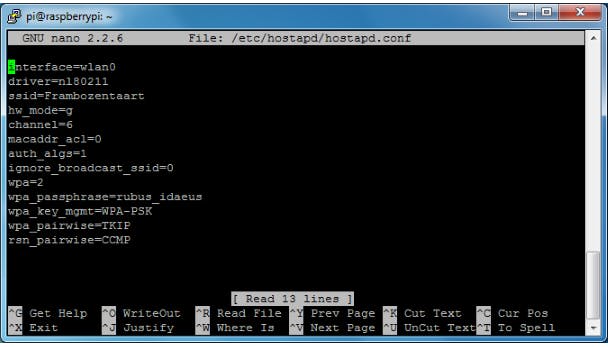 Nu het draadloze netwerk werkt, configureren we het toegangspunt. Dat kan met sudo nano /etc/hostapd/hostapd.conf. We maken hiermee een nieuw configuratiebestand. Vul dat met de eerste set regels uit stap 3 van deze webpagina. Achter ssid vul je de naam in die je aan je draadloze netwerk wilt geven en achter wpa_passphrase vul je het wachtwoord in voor je netwerk. Sla het bestand op en sluit het af. De andere instellingen laat je voorlopig zo, maar ze zijn later nog te veranderen. Lees daarvoor de online documentatie.