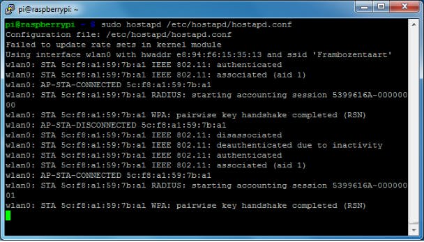 Nu is het moment daar om je hostapd-configuratie uit te proberen. Doe dat met de opdracht sudo hostapd /etc/hostapd/hostapd.conf. Kijk goed naar de meldingen van het programma om problemen te ontdekken. Probeer nu met een ander apparaat te verbinden met het draadloze netwerk met het SSID dat je geconfigureerd hebt. Vul het gekozen wachtwoord in. Als alles goed gaat, krijg je in de uitvoer van hostapd de verbinding te zien, samen met het MAC-adres van het verbonden apparaat. Als dat werkt, druk dan op Ctrl+C om hostapd af te sluiten.