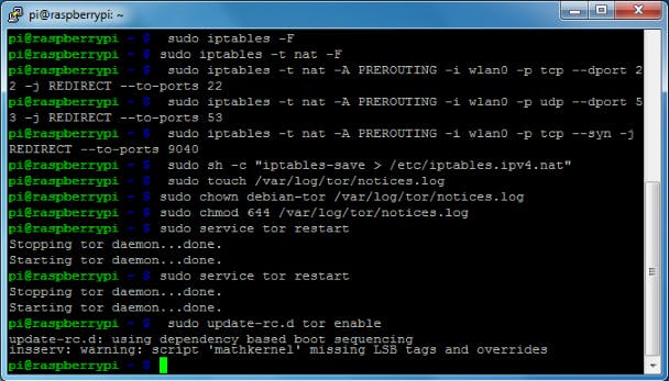 Sla eerst de NAT-configuratie op met sudo sh -c "iptables-save > /etc/iptables.ipv4.nat". In stap 10 hebben we er al voor gezorgd dat die configuratie bij het booten van je Pi ingelezen wordt. Nu maken we nog een logbestand aan voor Tor: sudo touch /var/log/tor/notices.log, sudo chown debian-tor /var/log/tor/notices.log en sudo chmod 644 /var/log/tor/notices.log. Herstart Tor (sudo service tor restart) en controleer of je geen foutmeldingen ziet. Vervolgens laat je Tor automatisch mee opstarten met de opdracht sudo update-rc.d tor enable.