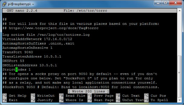Tor installeren gaat gelukkig eenvoudig: het zit gewoonweg in de repository van Raspbian. Voer daarvoor sudo apt-get install tor uit. Open daarna het configuratiebestand met sudo nano /etc/tor/torrc en voeg daaraan de volgende regels toe: Log notice file /var/log/tor/notices.log, VirtualAddrNetwork 172.16.0.0/12, AutomapHostsSuffixes .onion,.exit, AutomapHostsOnResolve 1, TransPort 9040, TransListenAddress 10.5.5.1, DNSPort 53 en DNSListenAddress 10.5.5.1. Zorg dat bij TransListenAddress en DNSListenAddress hetzelfde IP-adres staat als het statische adres van je wifi-interface. Sla het bestand op met Ctrl+O en sluit het af met Ctrl+X.